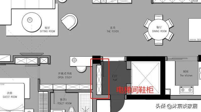 女屋主家是一梯一户的房型,大大增加了一家人的私密性和舒适性,整个一层都属于他们家,所以他们把鞋柜设计在走道间,电梯门一开便正对着一排鞋柜,超大的空间满足一家五口的日常。