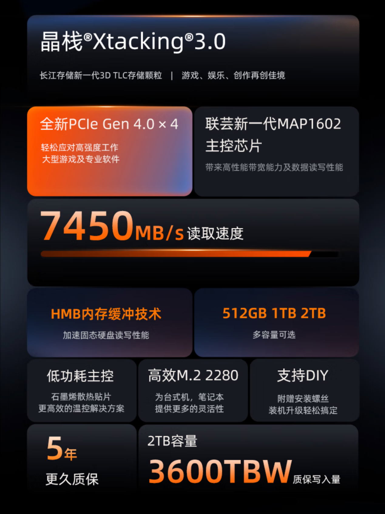 aigo推出的P7000Z、P5000Z超高速SSD产品采用了长江存储旗下最新的3D TLC闪存颗粒,具有更高的读写速度和更长的使用寿命,顺序读写速度分别达到了7450MB/s和5000MB/s。其中P7000Z采用的这颗闪存芯片搭载了由长江存储自主研发的Xtacking 3.0堆叠工艺,较上一代闪存颗粒大幅度提升了读写性能,能够进一步释放3D NAND闪存潜能,令存储密度、I/O传输速度及产品功能等方面性能再次飞跃。单颗闪存芯片接口速度高达2400MT/s,写入量更加持久,2TB容量规格的产品总写入量高达3600TBW,使用寿命大大超出以往的产品设计。即便是长期运行大型游戏/大型软件,频繁读取、写入硬盘也能提供超强的运行稳定性及数据安全保障。